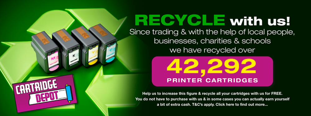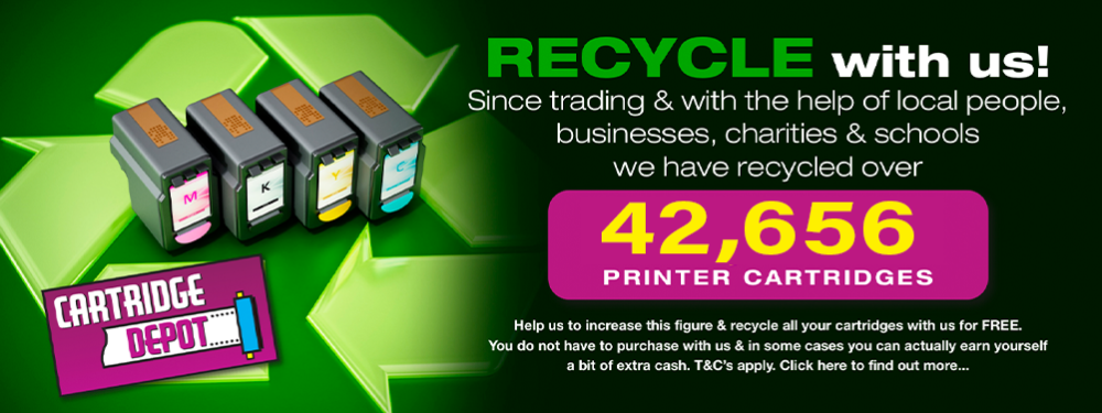 At Cartridge Depot we strive to help our customers save money, but it will also help them save the environment by recycling all their empty printer cartridges. In addition to this we run a recycling scheme for local businesses, charities and schools returning a donation on collection of empties.